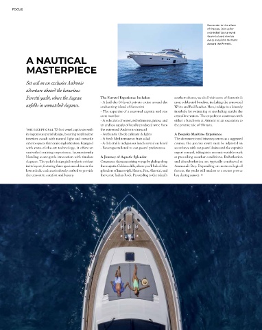 Ferretti yacht, where the Aegean The Ferretti Experience Includes: southern shores, we shall visit some of Santorini’s