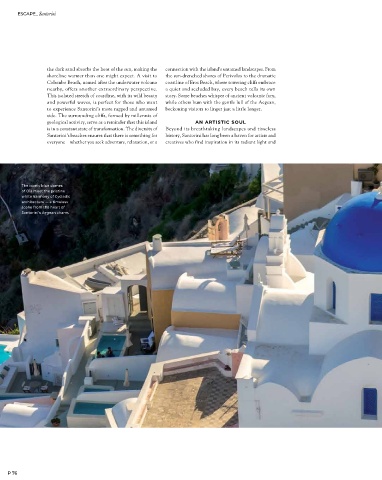 the dark sand absorbs the heat of the sun, making the connection with the island’s untamed landscapes. From dramatic scenery. The island is a living canvas where Santorini’s signature blues and whites come to life in
