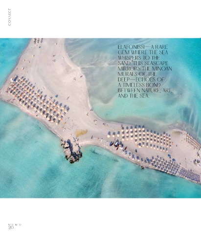world. That same reverence for the sea finds its echo today at Elafonissi (opposite page)—a natural marine gem off Crete’s southwestern coast. With its