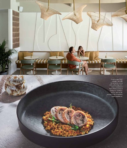 sculptural furniture. The palette is sun-kissed: warm whites,