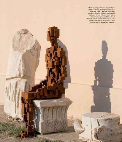 seated atop a classical capital, becomes ANTONY GORMLEY, 2020. PHOTOGRAPH BY JOHN O’ROURKE. PHOTOGRAPHER OF THE EVENT ©MARIA MARAKI. OPPOSITE, ANTONY GORMLEY, RULE II, 2019. INSTALLATION VIEW, SIGHT,